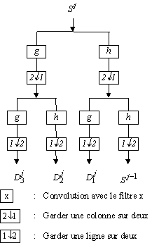 La texture est un phénomène de type moyenne fréquence. Une analyse fréquentielle, assurée par une décomposition en ondelettes, couplée à une analyse statistiques réalisée par des opérateurs du type matrices de cooccurrences ou matrices de longueur de plages nous procure des résultats intéressants [ZAR96C]. La démarche développée est la suivante. Sur une image d'une texture nous calculons un vecteur de cinq paramètres issus d'analyse statistiques. Puis, nous décomposons l'image en quatre sous-images de résolution inférieure selon le schéma donné sur la figure II.7. Les filtres h et g sont des filtres miroirs en quadrature monodimensionnels, l'un de type passe-haut et l'autre passe-bas. Ces quatre sous-images s'obtiennent sans redondance d'information.